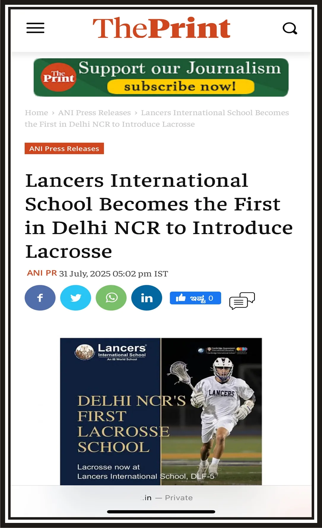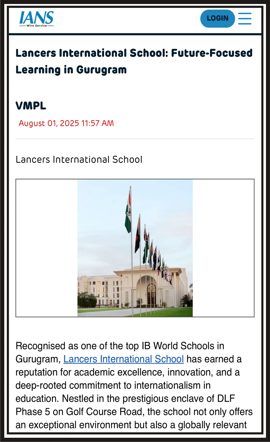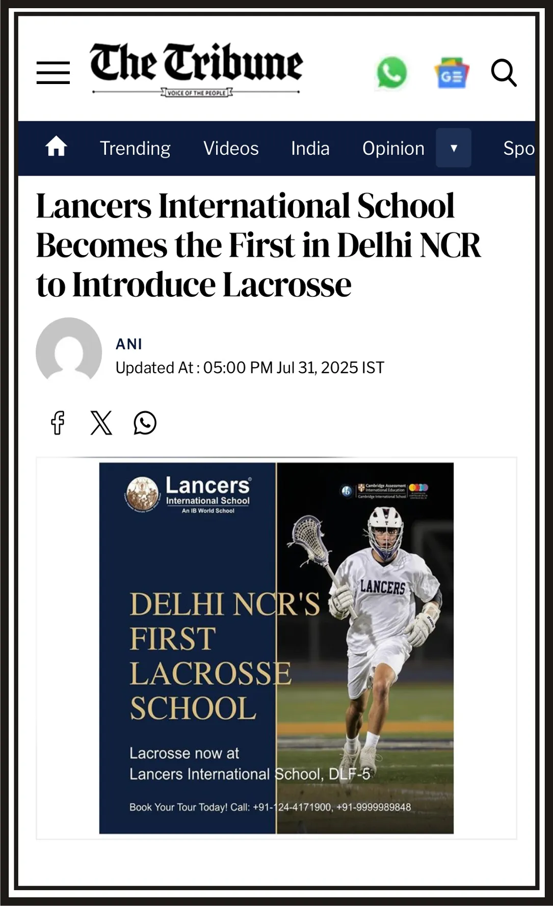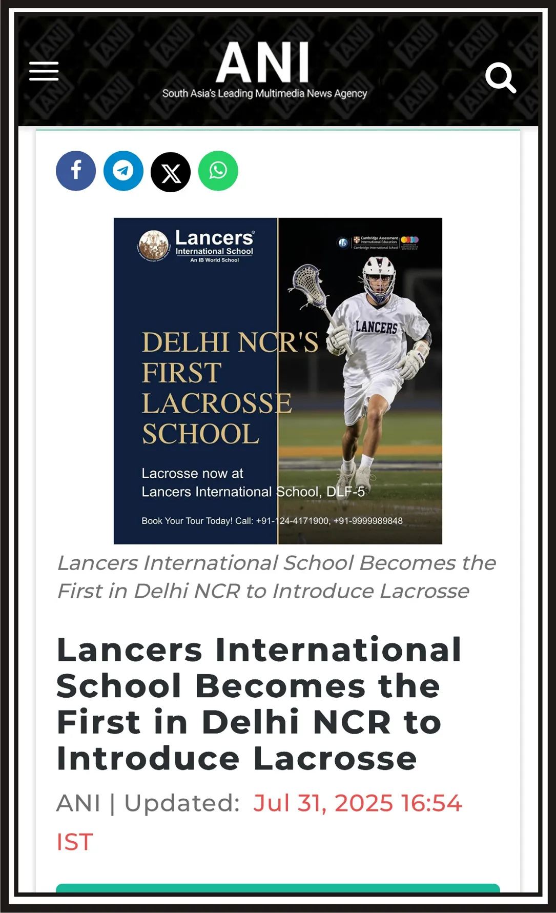 News News Home News About UsWelcome from the Head Mission & Values Lancers Global Leadership Affiliations & Accreditation’s Collaborations School Policies Working with LIS Careers Safeguarding Digital Platforms Testimonials AdmissionAdmission Process Fees Apply Now International Admissions Get A Call Back Book A Tour AcademicCurriculum Primary School Early Years Curriculum EY SPARK Primary Curriculum PYP Exhibition Language Programme External Assessments Middle School IB MYP IB MYP Curriculum IB MYP E-Assessment Community & Personal Projects IGCSE Cambridge International Certificate in Education (ICE) Senior School IBDP Curriculum CAS Program Extended Essay Timeline IB CAREER-RELATED PROGRAMME (IBCP) Higher Education Oxford Summer School School LifeArt Music ABRSM Sports Student Wellbeing Student Care Drama Co-Curricular Service Learning Little ABLE Able Cafeteria Student Council Lancers’ Library Student Publications BoardingWelcome To Boarding Room Allocation Academic Support Daily Schedule NewsAll news EventsAll Events Contact UsContact Information News August 5, 2025 Lancers is now the first school in India to be accredited by Swim England by Admin LIS News July 31, 2025 Lancers International School Becomes the First in Delhi NCR to Introduce Lacrosse – ANI by Admin LIS News July 31, 2025 Lancers International School Becomes the First in Delhi NCR to Introduce Lacrosse – Business Standard by Admin LIS News July 31, 2025 Lancers International School Becomes the First in Delhi NCR to Introduce Lacrosse – The Print by Admin LIS News July 31, 2025 Lancers International School: Future-Focused Learning in Gurugram – IANS by Admin LIS News July 31, 2025 Lancers International School Becomes the First in Delhi NCR to Introduce Lacrosse – The Tribune by Admin LIS News March 5, 2025 Lancers International School Hosts Korean Festival To Celebrate Cultural Diversity by Admin LIS News February 22, 2025 Lancers International School to Dazzle at Asian Unity Golf Cup 2025 with Cultural Performances today by Admin LIS News February 13, 2025 Lancers Hosts a Vibrant Japanese Fest, Celebrating Diversity and Embracing Other Cultures by Admin LIS News December 23, 2024 Lancers International School’s Annual Winter Carnival Celebrates Community, Culture, Charity by Admin LIS News November 17, 2023 Japanese students Visit Lancers International School Under Cultural Exchange Program by Admin LIS Important News, News September 30, 2022 Lancers International School Hosts Inter-School Gymnastics Cup by Admin LIS News April 20, 2022 Parents wary of sending children to school as cases rise in Delhi, nearby cities by Admin LIS News April 20, 2022 Two years on, entry-level students get their first taste of a real classroom by Admin LIS Important News, News February 15, 2022 School Opens for Grades 1 – 12 by Admin LIS News February 5, 2022 Schools Reopen, Parents Reluctant To Send Their Children by Admin LIS News December 2, 2021 LIS Among the Top IB Schools in the World by Admin LIS News December 1, 2021 LIS Ranked #1 IB School in North India by Admin LIS News November 25, 2021 School of Excellence Award Under the Climate Action Project by Admin LIS Important News, News November 15, 2021 Lancers International School honoured with prestigious ‘Climate Action Project School of Excellence’ award by Admin LIS Important News, News September 7, 2021 ISBF collaborates with Lancers International School, Gurugram by Admin LIS Important News, News August 26, 2021 ISBF Collaborates With Lancers International School To Open EMF Club by Admin LIS Important News, News August 25, 2021 ISBF Collaborates With Lancers International School Gurugram As Delhi NCR Gets Its First EMF Club by Admin LIS Important News, News June 19, 2021 LIS celebrates its 2021 Graduating Class by Admin LIS Important News, News February 23, 2021 Lancers International School supports reopening of school for primary students by Admin LIS News November 19, 2020 The New York Times- 2019 Asia Pacific Writing Competition by Admin LIS News November 19, 2020 Howard MUN-Agasthyaa Vishvanathan, participates in Howard Mun gets Honourable mention (3rd-16th August, 2020) by Admin LIS News August 22, 2020 University and Career Counselling Event by Admin LIS News August 18, 2020 Lancers supports usage of responsible social media amongst students by Admin LIS Important News, News April 7, 2020 Jovian Dravidian -Grade 5 Student reaches out to the PM of India. by Admin LIS Important News, News March 25, 2020 Admissions open for IBDP Students by Admin LIS Important News, News March 11, 2020 100% Scholarship at Tokyo International University by Admin LIS Important News, News September 24, 2019 Learning by discovering The Statesman by Admin LIS Important News, News December 4, 2018 ‘School bags may take time to shed weight in Gurugram’- Hindustan Times by Admin LIS Important News, News November 29, 2018 How schools tutor kids to tackle pollution as haze chokes City- The Times of India by Admin LIS Important News, News November 28, 2018 Why kids are forced to carry heavy bags despite many orders- The Times of India by Admin LIS Important News, News November 12, 2018 Gurgaon students go spooky this Halloween by Admin LIS Important News, News November 5, 2018 ‘To combat pollution, Gurgaon schools install vertical gardens’- The Indian Express by Admin LIS Important News, News October 31, 2018 ‘Schools turn to air purifiers, vertical gardens’- Hindustan Times by Admin LIS Important News, News October 31, 2018 ‘Lancers International’s Annual Inter School Fest concludes amidst enthusiasm’ by Admin LIS Important News, News October 24, 2018 ‘Monitor kids online, schools tell parents’ -The Times of India by Admin LIS Important News, News October 20, 2018 ‘Baatein Aman Ki’ reaches Gurugram city to promote peace by Admin LIS Important News, News October 19, 2018 ‘Students of this Gurgaon school win north India’s biggest start-up contest’ 