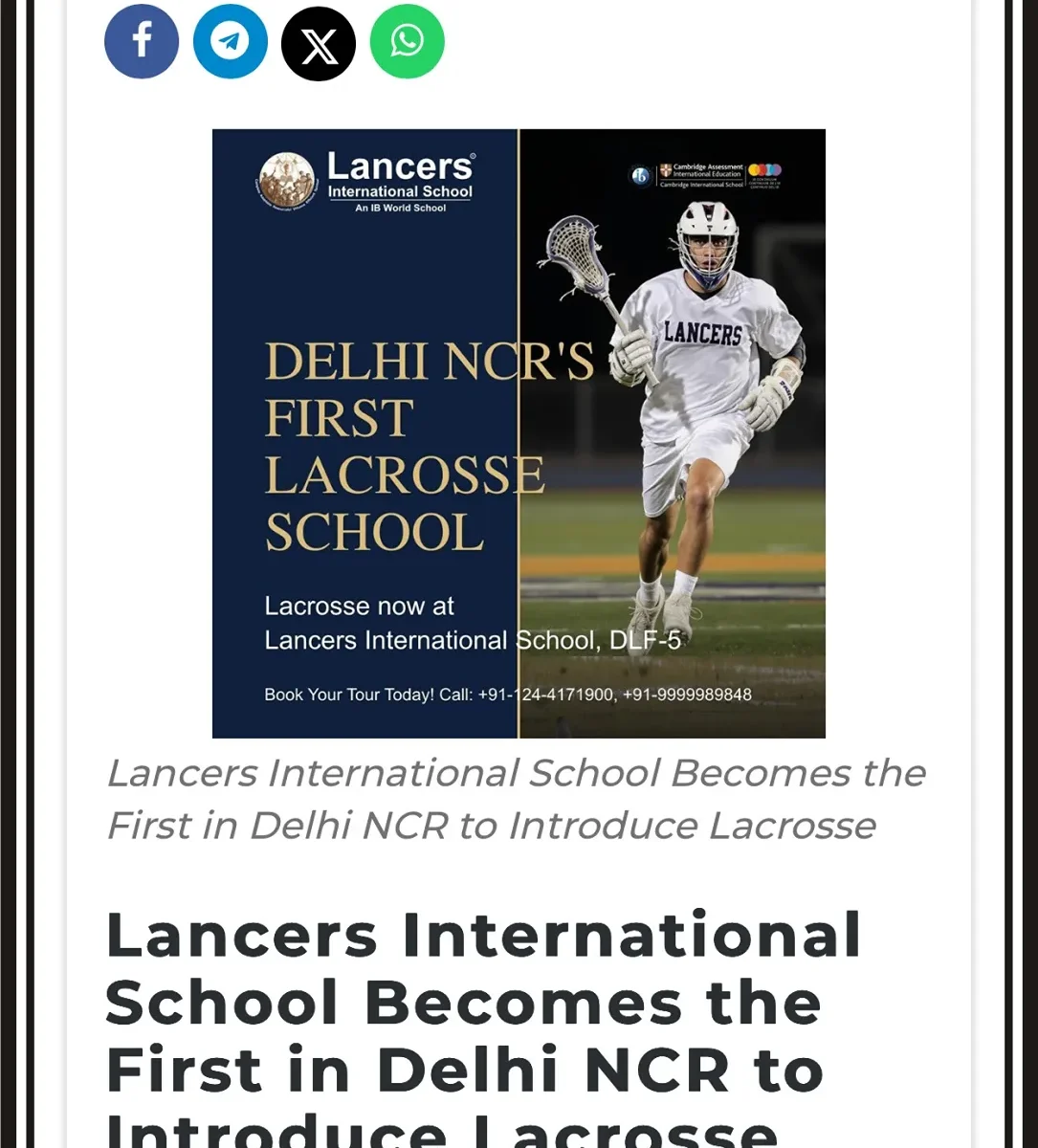 Posted on July 31, 2025August 2, 2025 by Admin LISLancers International School Becomes the First in Delhi NCR to Introduce Lacrosse – ANI ANI – https://aninews.in/news/business/lancers-international-school-becomes-the-first-in-delhi-ncr-to-introduce-lacrosse20250731165458/